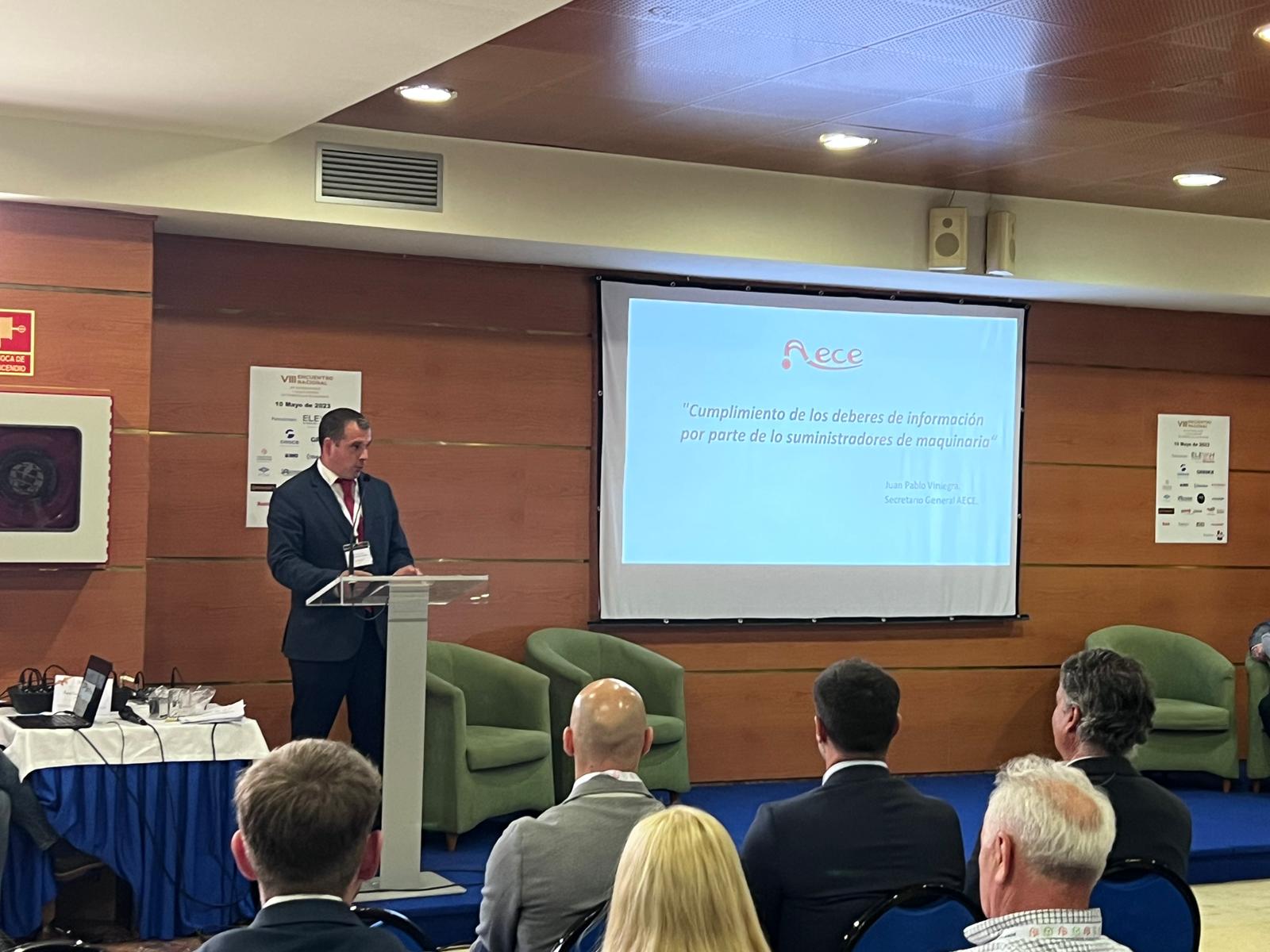 AECE participó en esta edición con una ponencia sobre “El cumplimiento de los deberes de información por parte de los suministradores de maquinaria”, a cargo de Juan Pablo Viniegra, secretario general de AECE, que puso el énfasis en la normativa y la seguridad en el trabajo en este sector y la importancia del manual de instrucciones de seguridad que AECE pone a disposición de sus socios para contribuir con la seguridad en el trabajo, reducir la siniestralidad laboral y cumplir con las obligaciones impuestas por la legislación preventiva.